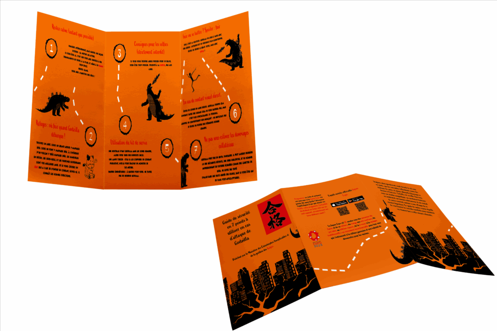 Création d’un dépliant humoristique et ludique pour les 70 ans de Godzilla. Objectif : capturer l’énergie, la culture pop et l’esprit décalé du festival, tout en facilitant l’orientation des visiteurs dans ce guide de survie.